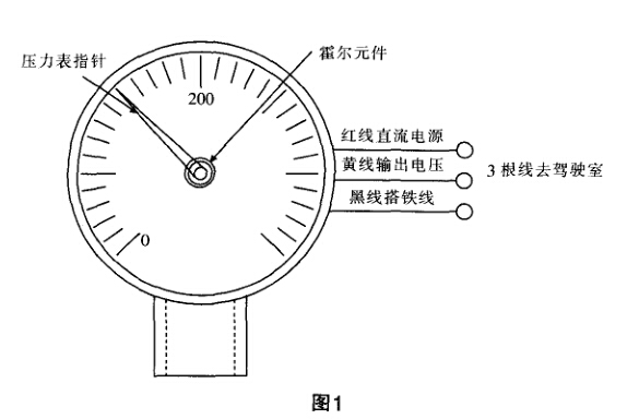 CNG壓力表指針上帶有霍爾元件,霍爾 元件隨指針轉動而轉動。轉動改變了霍爾元 件與固定在壓力表里的磁鋼板距離,使霍爾 元件接受的磁場強度發生了變化,從而改變 了輸出電壓信號的強弱。CNG壓力表的背后 有3根連接線,線的顏色一般為紅、黑、黃。紅 線為信號源供電電源,一般為直流電壓12V+
