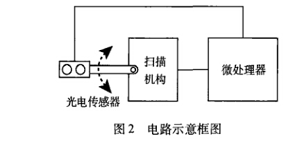 光電傳感器可采用反射式紅外光電傳感器,通過合理 配置其外圍偏置電路使得光電傳感器置于壓力表指針上方時,有較為顯著的輸出變化。微處理器控制掃描機(jī)構(gòu)按一 定的步距角進(jìn)行掃描,光電傳感器在搖桿的帶動下沿指針 運(yùn)行軌跡運(yùn)動,微處理器通過AD轉(zhuǎn)換讀取光電傳感器輸 出值,其電路示意框圖如圖2所示。