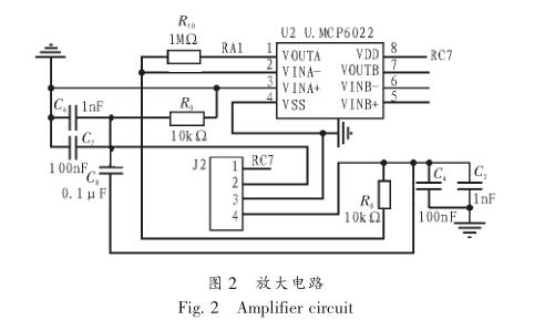 放大電路模塊主要是把傳感器的小信號進行放大,然后 輸送給單片機處理。放大電路選用的芯片是MCP6022它是個運放芯片,低噪聲,穩定性比較好,而且電源電壓符合設 計要求。