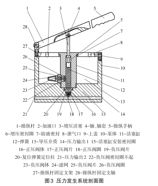該技術在于把復雜的、分散的壓力發生系統進行 科學的、適用的集成,特別是在單向閥體、閥片方面進 行創新,一個鏡面的不易結垢的金屬薄片材料,用線切 割的方法加丁成同心圓形的,四面帶有對稱弧面缺口 的閥片,該閥片在單向閥腔內由4個突出于弧面的棱角 定位,其鏡面與密封圈緊密配合,當閥片兩側形成壓力 差時,該閥片在單向閥腔內的定位空間內沿閥片中心 點軸心直線動作,實現開關,導壓介質通過閥片弧面缺 口單方向輸出發生壓力。單向閥分別正反向安裝于活 塞腔的側面和底部,導壓介質儲液倉設計于泵體與增 壓缸體間,增壓活塞有平面和側面兩道密封安裝與泵體底部設計有注液口、泄氣塞、操縱桿固定軸的上蓋 由密封圈、定位槽限制,用內六角螺栓安裝于泵體上, 操縱桿與增壓活塞的作用點設計有滾動軸套用滾動軸 裝配于操縱桿上。見圖3壓力發生系統剖面圖。安裝 于泵體底座的增壓缸體11,緊密配合于增壓缸體11 的增壓活塞3,操縱桿1在操縱手柄5的作用下,安裝與 操縱桿1的軸套4,帶動增壓活塞3,以增壓缸體軸心為 直線向下運動,增壓缸體11內的導壓介質13推開正壓 閥體16內的正壓閥片17輸出,操縱桿1在操縱手柄5 外力釋放時,增壓活塞3在復位彈簧12的作用下返回 上始點,增壓缸體11內形成負壓,導壓介質13推開負 壓閥體23內的負壓閥片25輸人增壓缸體11,如此循環 作用,設計于泵體10內儲液倉的導壓介質13連續通過 輸出I 14和輸出H21排出,實現造壓。