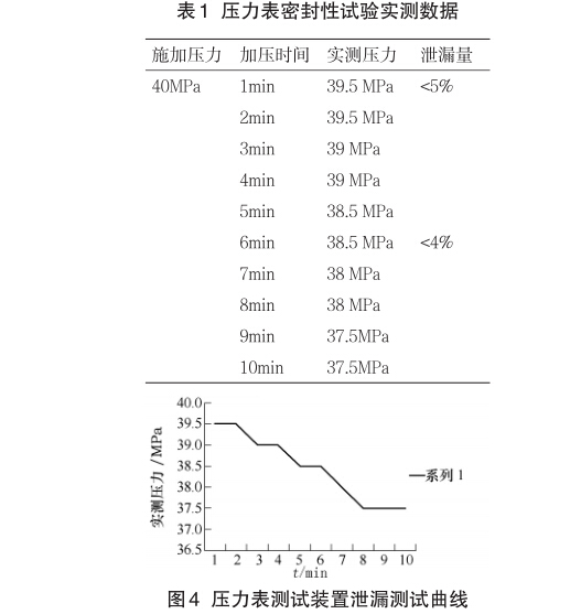 檢定規程中對壓力表校驗器的規定,加壓5min 開始計時,5min的泄漏量不得超過滿量程的4%。壓力 表密封性試驗實測數據見表1,壓力表測試裝置泄漏測 試曲線見圖4。