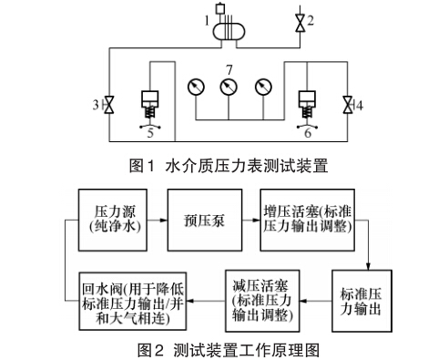 水介質壓力表測試裝置是由水介質高壓壓力源、 油水隔離器和標準數字壓力表組成,如圖1所示。測試 裝置丁作原理圖如圖2所示。