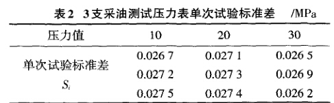 任意選取3塊同類型的采油測試壓力表,每塊 在30、20、lOMPa連續測10次,共得9組測量列,每 組測量列分別按公式(1)計算得出的單次試驗標準 差,如表2所示。