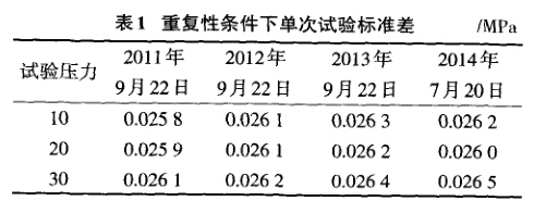 采用一支相對穩定的準確度等級為1.0級、量程為0~30MPa的一般壓力表,按照JJF 1033-2008《計量標準考核規范》,同 時結合JJF 1059.1-2012《測量不確定評定與表示》的要求,對建標后的采油測試壓力表檢定裝置進行技術評定和校驗,實現、保 存和復現對采油測試壓力表的量值傳遞。在一定范圍內開展一定準確度等級采油測試壓力表的校準或檢測,以達到對該采油 測試壓力表檢定裝置進行復查考核的相關要求。結果表明,準確度等級為0.25級的壓力表檢定裝置,重復性考核符合JJF 1033-2008相關條款的要求,可以完成L0級及其以下的壓力表的校準工作。