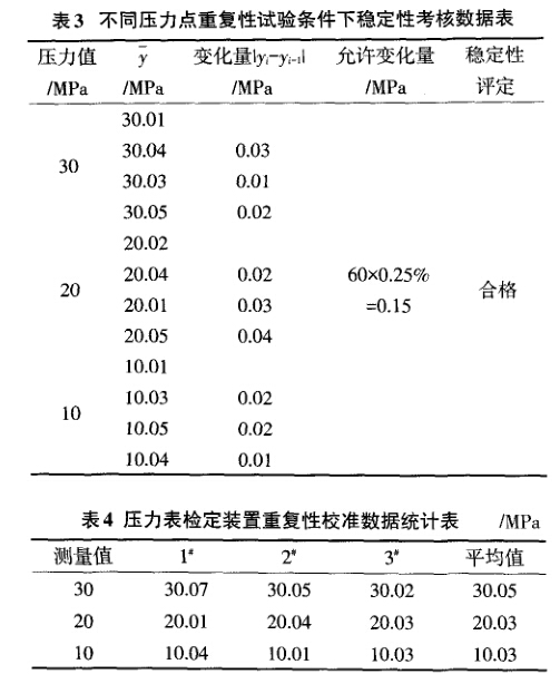 采油測試壓力表檢定裝置于2009年建立標準 以來,至2012年進行復查標準。對同一支相對穩定 的壓力表在30、20、10MPa 3個壓力檢定點下,每年 分別重復測量10次,取每次算術平均值作為測量結 果,以相鄰兩年的測量結果之差作為該時間段內計 量標準的穩定性考核,其結果見表3。