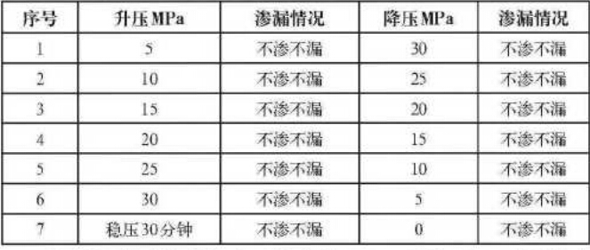 通過上表可以看出當壓力升致30MPa且穩壓30分鐘仍表 現為不滲不漏,說明了該裝置密封性能和剛壓性能良好。