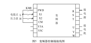 圖5所示為變頻器控制端接線圖。圖中,數(shù)字 輸入端FWD的通斷決定變頻器的運(yùn)行狀態(tài),由變 頻器供電接觸器KM0的常開(kāi)輔助觸點(diǎn)控制,一旦 接觸器KM0吸合,變頻器得電,輔助觸點(diǎn)接通, 變頻器就開(kāi)始運(yùn)行。當(dāng)KM0斷開(kāi)時(shí),F(xiàn)WD端無(wú)輸入信號(hào),變頻器停止運(yùn)行。H和L為電接點(diǎn)壓力表 的上下限觸點(diǎn),可以在表上進(jìn)行調(diào)節(jié)。數(shù)字輸入 端X1和X2的通斷決定變頻器頻率的變化。當(dāng)X1端 接通X2端斷開(kāi)時(shí)變頻器頻率上升,而數(shù)字輸入端 X1端斷開(kāi)X2端接通時(shí)變頻器頻率下降,二者同時(shí) 接通或同時(shí)斷開(kāi),變頻器頻率保持不變。