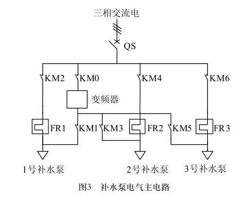 鍋爐補(bǔ)水泵多采用一用一備的兩臺(tái)泵工作方 式,也有采用多用一備的方式,本文以兩用一備 的三臺(tái)泵方式為例進(jìn)行介紹。為了在變頻器故障 時(shí)補(bǔ)水泵仍能為鍋爐補(bǔ)水,所設(shè)計(jì)的電路應(yīng)包括 變頻運(yùn)行和工頻運(yùn)行兩部分,通過(guò)轉(zhuǎn)換開(kāi)關(guān)進(jìn)行 切換。圖3給出了三臺(tái)泵的主電路圖。