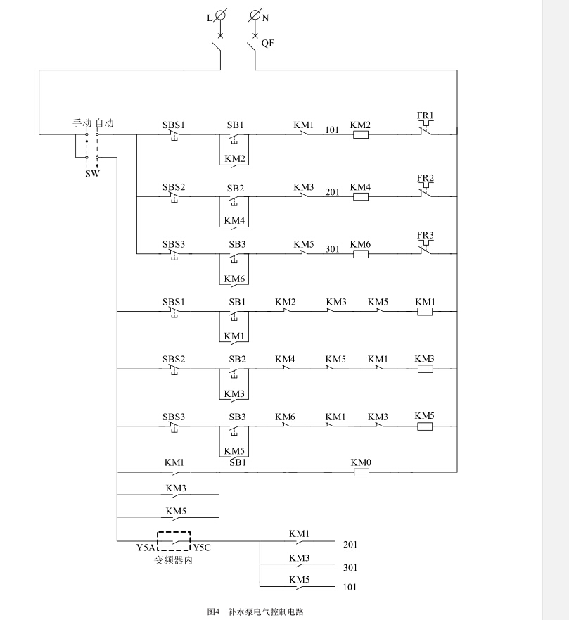 圖4即為與圖3主電路相對(duì)應(yīng)的控制電路。圖 4中的QF為控制電路電源開(kāi)關(guān),SW為轉(zhuǎn)換開(kāi)關(guān), 用于選擇補(bǔ)水泵的手動(dòng)工頻運(yùn)行方式和自動(dòng)變頻 運(yùn)行方式,每臺(tái)補(bǔ)水泵通過(guò)相應(yīng)的按鈕起動(dòng)或停 止。工頻與變頻之間通過(guò)接觸器線圈回路里互串 對(duì)方的常閉觸點(diǎn)進(jìn)行互鎖。用于3臺(tái)泵變頻運(yùn)行 的接觸器KM1、KM3和KM5也設(shè)置了互鎖,以避 免變頻器同時(shí)驅(qū)動(dòng)多臺(tái)電動(dòng)機(jī)。30A與30C之間的 虛線框內(nèi)的常開(kāi)觸點(diǎn)為變頻其內(nèi)部繼電器觸點(diǎn), 用于自動(dòng)運(yùn)行時(shí)控制第二臺(tái)電機(jī)的起停。在自動(dòng) 狀態(tài)時(shí),當(dāng)變頻器驅(qū)動(dòng)一臺(tái)水泵補(bǔ)水時(shí),若變頻 器輸出頻率已達(dá)到最大頻率(一般設(shè)為50Hz), 補(bǔ)水壓力仍不能滿足要求,該觸點(diǎn)閉合,自動(dòng)工 頻起動(dòng)第二臺(tái)水泵。當(dāng)兩臺(tái)泵補(bǔ)水時(shí)壓力超出設(shè) 定壓力,且變頻器輸出頻率為最低時(shí),該觸點(diǎn)斷 開(kāi),自動(dòng)停止第二臺(tái)水泵。具體由哪兩臺(tái)水泵運(yùn) 行,通過(guò)按鈕來(lái)控制。比如要讓1號(hào)泵和2號(hào)泵運(yùn) 行,則按下SB1進(jìn)行起動(dòng),1號(hào)泵變頻運(yùn)行,補(bǔ)水 壓力不足時(shí),自動(dòng)起動(dòng)2號(hào)泵,2號(hào)泵工頻運(yùn)行, 當(dāng)超壓時(shí),自動(dòng)停止2號(hào)泵。如果讓3號(hào)泵和1號(hào)泵 運(yùn)行,則按下SB3按鈕,3號(hào)變頻運(yùn)行,補(bǔ)水壓力 不足時(shí),自動(dòng)起動(dòng)1號(hào)泵,1號(hào)泵工頻運(yùn)行,當(dāng)超 壓時(shí),自動(dòng)停止1號(hào)泵。