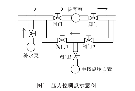供熱采暖鍋爐補(bǔ)水泵應(yīng)保證整個(gè)供熱系統(tǒng)充 滿水,管網(wǎng)內(nèi)不進(jìn)空氣,避免影響供暖質(zhì)量。許 多文獻(xiàn)介紹的壓力采樣點(diǎn)在熱水循環(huán)泵的入口 處,其特點(diǎn)是當(dāng)循環(huán)泵運(yùn)行時(shí),其入口壓降低, 需要的補(bǔ)水壓低,補(bǔ)水泵變頻器輸出頻率低,補(bǔ) 水泵轉(zhuǎn)速無(wú)需太高即可滿足所要求的壓力,其原 因是利用了循環(huán)泵的吸程。當(dāng)循環(huán)泵停止運(yùn)行 時(shí),其入口壓升高,超過(guò)了所設(shè)定的壓力,補(bǔ)水 泵停止運(yùn)行。一旦循環(huán)泵停止運(yùn)行,其出口壓會(huì) 降低,極易造成建筑物最高處缺水而進(jìn)氣,從而 影響用戶采暖。導(dǎo)致這一現(xiàn)象的原因是補(bǔ)水泵的 壓力控制點(diǎn)不夠合理,因而找到合適的壓力控制 點(diǎn)并對(duì)該點(diǎn)壓力進(jìn)行控制成為解決問(wèn)題的關(guān)鍵。 合理的壓力控制點(diǎn)應(yīng)保證在循環(huán)泵停止運(yùn)行后供 熱管網(wǎng)內(nèi)不進(jìn)氣,不管循環(huán)泵是否運(yùn)行,管網(wǎng)內(nèi)都 應(yīng)充滿水,既不進(jìn)氣,補(bǔ)水壓又不是太高,以保證 供熱管網(wǎng)和暖氣片的安全,避免供暖設(shè)施和管路滲 漏。圖1中箭頭方向表示循環(huán)水流動(dòng)方向,閥門(mén)3處 為壓力采樣控制點(diǎn)。為了保證循環(huán)泵運(yùn)行與停止時(shí) 壓力控制點(diǎn)的壓力相同,可以通過(guò)調(diào)節(jié)閥門(mén)1和閥 門(mén)2的開(kāi)度來(lái)實(shí)現(xiàn)。具體操作時(shí),應(yīng)使壓力采樣點(diǎn) 的壓力在循環(huán)泵運(yùn)行時(shí)比停止時(shí)略低, 這樣可以在 循環(huán)泵停止運(yùn)行后補(bǔ)水泵也停止運(yùn)行。