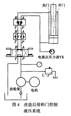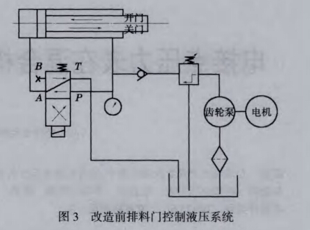 在排料門打開和關閉過程中,連桿,轉臂的動作和液壓缸的 活塞桿縮回或伸出通過機械限位裝置、行程限位開關及電磁換 向閥配合實現.排料門液壓系統見圖3。