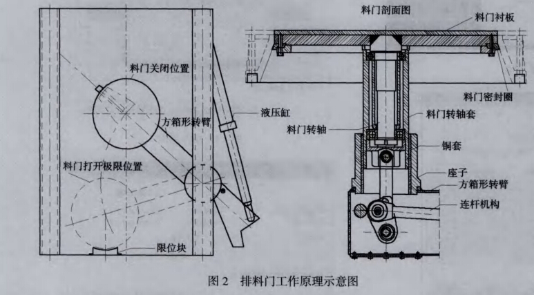 但實際使用中,鋼絲繩因 排料門蓋轉軸套偶爾的輕 微轉動,經常會造成排料 門關閉不到位漏料或行程 開關損壞等故障,而要處理 這些故障必須打開下料漏 斗,維修人員鉆進漏斗內 才能處理,很不方便。