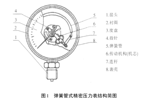 彈簧管式精密壓力表由接頭、度盤、指針、彈簧管、傳 動機構和外殼等組成,如圖1所示。壓力的示值主要通 過彈簧管的彈性形變經由表內機芯的轉換機構將彈簧管的彈性形變轉換成旋轉運動,引起指針偏轉來指示壓力。