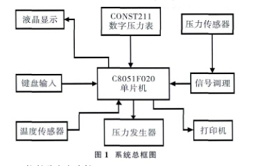 為滿足油田壓力儀表現場校驗的需要,提出開 發一種內嵌壓力源、能自動完成校驗過程的一體化 壓力表自動校驗。本系統采用基于C8051F020單片 機的可編程控制系統方案,由壓力發生器(壓力校驗 栗)、液晶顯示、CONST211數字壓力表、打印機、系 統校驗軟件以及它們之間的專用通訊電纜構成。系 統配以高精度的放大單元及A/D轉換器,進行嚴密 的零點及滿量程溫度誤差的補償,用單片機實現各 種數據的處理、分析、計算。通過面板薄膜開關作為 控制鍵盤,實現各種功能的設置。測量結果由液晶顯 示器顯示或通過RS-232接口輸出至計算機。下面 在系統總體組成框圖的基礎上簡要介紹幾個主要部 分的方案設計。系統總體組成框圖(圖l)。