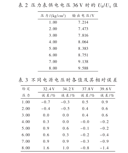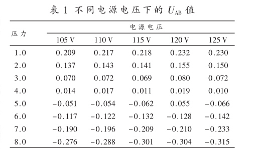 可見,UkB不僅與傳感器阻抗的相對變化量成正比,還與 電源電壓成正比。因此單純測量UkB不能計算出壓力 值,除非使用恒壓源供電方式,UkB才僅與y成正比,單 值地對應(yīng)壓力值。表1是不同電源電壓下測得UkB的實 際數(shù)據(jù)。從表1可見,UkB隨著電源電壓正比例變化。