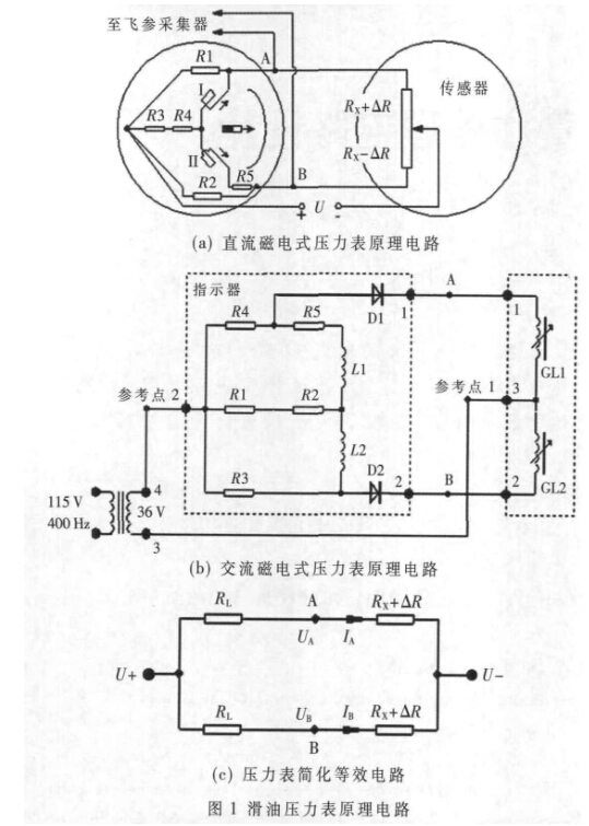 滑油壓力由壓力表系統(tǒng)進(jìn)行測量指示,該系統(tǒng)是一 種二線磁電式儀表系統(tǒng),由壓力傳感器和指示器構(gòu)成, 原理電路如圖1所示。圖1(a)是直流磁電壓力表原理電 路,圖1(b)是交流磁電壓力表原理電路,系統(tǒng)中的傳感 器在油壓作用下改變指示器中兩個工作線圈的電流比 值,此電流比與滑油壓力成一定函數(shù)關(guān)系,而指示器中 指針的轉(zhuǎn)角與該電流比也成同樣的函數(shù)關(guān)系。現(xiàn)在飛機(jī) 所裝備的飛參記錄設(shè)備利用測量(圖1中A、B兩點)電 壓的方法來計算滑油壓力,從多年來的使用情況看,飛 參記錄的滑油壓力值誤差很大,嚴(yán)重影響了發(fā)動機(jī)工作 性能的正確判定。從壓力表的工作原理可知,用A、B兩 點的電壓計算滑油壓力,此方法存在原理性錯誤,因此, 必須對其進(jìn)行改進(jìn),才能保證滑油壓力的準(zhǔn)確測量。