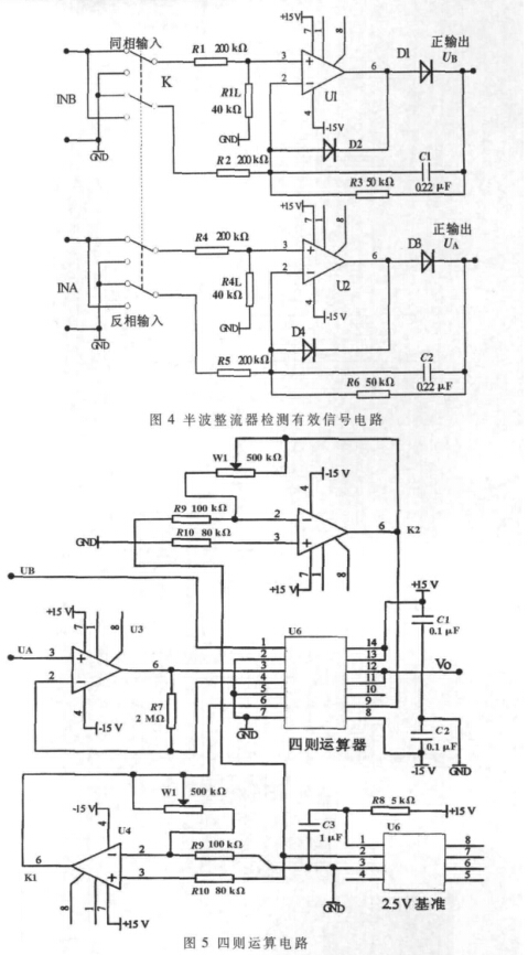 圖5是按式(7)設(shè)計的運算電路,其核心運算器U6 是模擬混合四則運算電路,其中U3為緩沖器,U4和其 外圍的各元件構(gòu)成了 一個同相放大器,以調(diào)整參數(shù)K!,