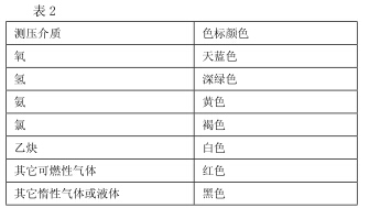 1、按其所測介質不同,在壓力表上規定有不同的色標, 并注明特殊介質的名稱,如表2所示。測量氧氣的壓力表還 在標度盤上標以紅色“禁油”字樣,此表必須嚴格禁油。鍋 爐上用的壓力表,色標顏色為黑色。