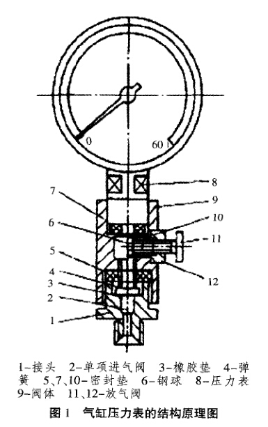 氣缸壓力表總成由0~5.88MPa量程的壓力表、連接軟管、單項進氣 閥和適用于各種機型的可換接頭等 組成。其上有放氣閥,以便使指針回 位到0。其結構如圖1所示。