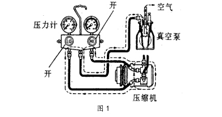 測(cè)量前先將壓力表組的高低壓手動(dòng)閥關(guān)閉,然后將壓力表組 的高低壓軟管分別連接于壓縮機(jī)相應(yīng)的檢修閥上(如圖1),并利 用制冷劑本身壓力排除管內(nèi)空氣。開(kāi)啟空調(diào)機(jī),這時(shí)高壓表指針 慢慢上升,低壓表指針慢慢下降,穩(wěn)定后即可讀出壓力值。