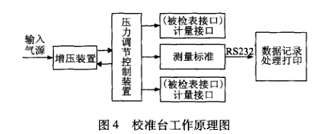 設計校準臺主要由增壓裝置、壓力調節控制裝置 組成;再增加拓展部分:用于顯示數值的測量標準、 記錄數據的軟件部分;參考一般的活塞式壓力計結構, 擬配兩個被檢表接口,一個測量標準(標準表)接口, 則可實現同時校準兩塊被檢表。如圖4所示,校準臺 的工作原理為:使用外接氣源輸人預增氣體壓力,經 增壓裝置升壓后,由壓力調節控制裝置控制輸出壓力, 并根據被檢壓力表校準點壓力的大小進行適量微調, 控制輸出需要的校準壓力,被檢表和測量標準同時測 量這一壓力值。測量標準通過RS232接口將數據傳輸 到軟件端進行記錄、存儲,由軟件處理后給出校準結 果或打印。