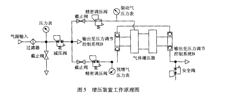 考慮功能實現和輕捷方便的因素,設計增壓裝置 由過濾器、減壓閥、精密調壓閥、截止閥、安全閥、 壓力表和氣體增壓器等部件構成。設計增壓裝置的工 作原理圖,如圖5所示。