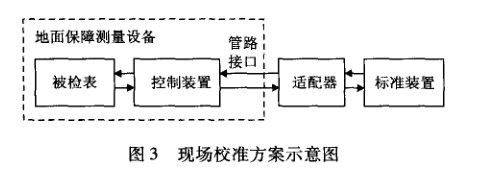 根據以上分析表明,專用測量設備上壓力表的現 場校準是切實可行的。本課題實施現場校準的思路為: 不拆卸壓力表,將壓力校準標準器(通用壓力表校準 臺)通過適配器與被檢壓力表所在的管路接口相連接, 然后經過調節校準臺或被檢設備上對應的控制裝置, 將氣體輸送到被檢表,再進行計量校準操作。如圖3 所示。