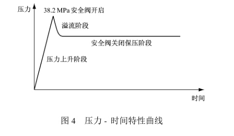特性曲線的檢測過程:首先開啟試驗臺壓力系 統(tǒng),加壓到38. 2 MPa額定壓力并保持,調(diào)整三用 閥,使其打開在溢流狀態(tài),通過流量檢測儀調(diào)整流量 在90?110 mL/min之間。此時關(guān)閉試驗臺動力使 整個系統(tǒng)處于密封狀態(tài),這時三用閥從開啟狀態(tài)逐 步到關(guān)閉密封狀態(tài),關(guān)閉后壓力要保持不變。壓力 表上顯示三用閥上壓力的變化情況,并且不斷地把 數(shù)據(jù)傳送到計算機(jī),計算機(jī)根據(jù)這些數(shù)據(jù),畫出壓力 -時間特性曲線。對于合格的三用閥,開啟后壓力 下降不應(yīng)超過額定壓力的15%,也就是關(guān)閉壓力不 小于32.5 MPa。當(dāng)壓力小于這一值時,設(shè)定自動報 警,圖4為壓力-時間特性曲線圖。