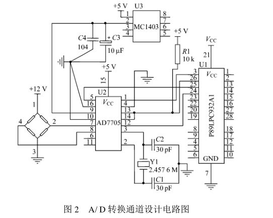 2 - A式A/D轉(zhuǎn)換器,它釆用三線串行接口,能大大 節(jié)省單片機(jī)的口線。該轉(zhuǎn)換器包括由緩沖器和增益 可編程放大器組成的前端模擬調(diào)節(jié)電路,能直接轉(zhuǎn) 換傳感器測量到的微小信號;具有高分辨率、寬動態(tài) 范圍、自校準(zhǔn)、優(yōu)良的抗噪聲性能,能達(dá)到0. 003 %非 線性的16位無誤碼數(shù)據(jù)輸出;16位數(shù)字量,基準(zhǔn)電 壓選擇為2. 5 V ,供電電壓為5 V時,滿量程輸入為 2. 5 mV ,其增益和數(shù)據(jù)輸出更新率均可編程設(shè)定, 非常適合儀表測量、工業(yè)控制等領(lǐng)域的應(yīng)用。圖2 為A/D轉(zhuǎn)換通道設(shè)計電路圖。