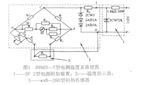 DF4B型內(nèi)燃機車使用的電測溫度表為DY603- T型,它由 溫度指示器WB、WZB- 260型溫度傳感器WBf、DF2型電源附 加裝置DF等部件組成。圖1為其原理圖。