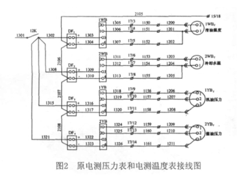 電測壓力表和電測溫度表電路原接線如圖2所示(此處只 畫出I室的接線圖,2室線號和接線柱號作相應(yīng)改變即可,加改 線路也一樣)。