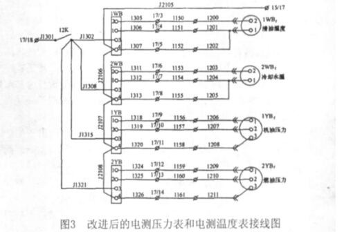 另外,改進的電路12K左側(cè)接X17/18,右側(cè)直接接到電測壓 力表和電測溫度表指示器3#接線柱上;各負端線的連接采用以 下方式:直接用導(dǎo)線將各電測壓力表和電測溫度表指示器4#接 線柱連接井引出一根線接到x 15/17上。為了能夠直觀區(qū)分各線 號又不與原線號發(fā)生沖突,可采用與原接線相同的線號,并加以 前綴J