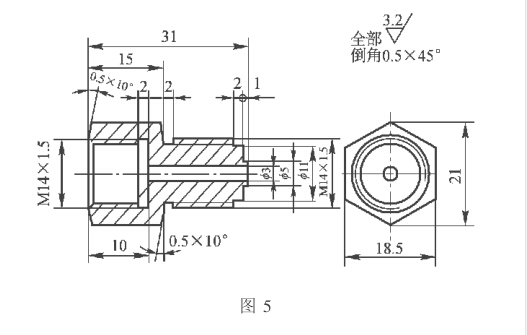 為了方便工作和節約開支,我們設計制造了一 個壓力表過渡接頭(圖1),此接頭用銅合金制造,直 接旋緊在消毒器蓋子上,而壓力表就裝在過渡接頭 上。因為壓力表接頭與過渡接頭的材料都是銅合 金,不易氧化,因此拆卸非常方便,經過幾年的實際 使用,壓力表在每次周期檢定時都能順利方便的拆 下,多年來未買過一只新表。