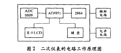 采用2節(jié)9 V電池并聯(lián)作為電源;選用小尺寸 液晶顯示板;采用成品化機(jī)殼;使用薄膜鍵盤,5 個(gè)鍵為:預(yù)置、回放、定位、置數(shù)和測(cè)量,基本滿 足測(cè)試需要。二次儀表電路部分的原理如圖2所 示。圖中ADC0809為A/D轉(zhuǎn)換器,將從一次儀表 獲得的模擬信號(hào)轉(zhuǎn)化為數(shù)字信號(hào);AT8951為低耗 高性能單片機(jī);2864為E2PROM電可擦寫存儲(chǔ)器, 存儲(chǔ)程序及測(cè)試數(shù)據(jù)。