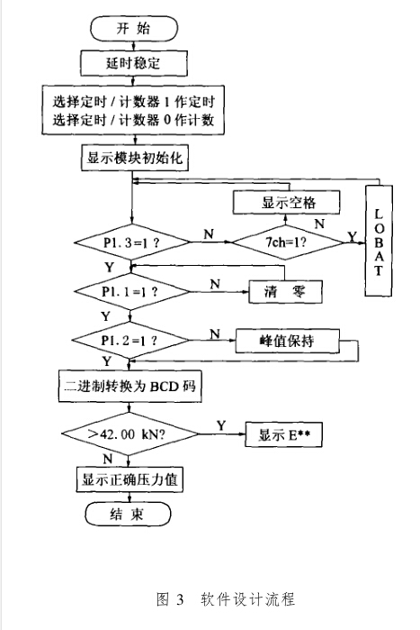 復(fù)位,儀表就能正常工作。該顯示器顯示時(shí)間間隔 為250 ms^即250 ms采集一次數(shù)據(jù),也就是滿250 ms就中斷一次。該表的最大量程為42. 00 kN, 如大于42.00kN就會顯示出錯(cuò)信息“ E* * ”。如 小于42. 00 kN,則顯示正確的壓力。