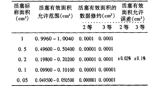 主要是指確定活塞有效面積的不確定度及有效面積 的變化引起的壓力測量誤差,可以通過檢定活塞有效面積 與調整專用砝碼的質量來減小測量誤差?;钊行娣e的 允許誤差如下表: