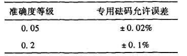 是指標準砝碼實際值偏離理論值和砝碼質量變化所 引起的測量誤差。專用砝碼質量允許誤差如下表: