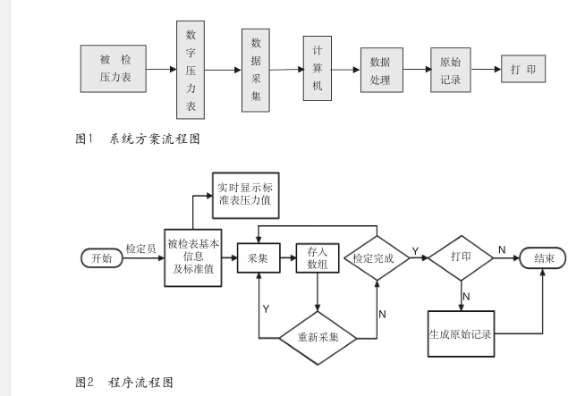 整個測量系統由硬件和軟件兩部 分組成,主要工作流程是利用數字壓力 校驗儀測量被檢壓力表加壓在檢定值時 的壓力值,通過RS-232數據采集設備將 檢定值傳輸至計算機,采用上位機程序 對所采集數據進行計算、分析和處理,根 據需要生成原始記錄并打印。系統方案 流程圖如圖1所示。