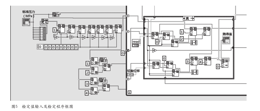 開始檢定前,輸人被檢表基本信息及所需檢定 的檢定值,確定無誤后運行程序,使用標準壓力泵進 行壓力加載,待被檢表顯示在所需檢定的檢定點處, 輕敲被檢表,觀察被檢表指針漂移情況,并將輕敲位 移結果輸人到“輕敲位移”控件中隨后按下手控開關 釆集標準數字表上的壓力值,這樣便將檢定點的實際標準值及其輕敲位移采集顯示到主界 面相應位置。接著,根據需要重復上述過 程,繼續進行下一個檢定點的檢定。在整 個過程中,會發生因壓力未加壓到檢定 點而導致采集失誤的情況,因此設計了 “上一步”功能,檢定員可使用“上一步” 按鈕實現某個檢定點的再次檢定。上位 機實現程序如圖5所示。