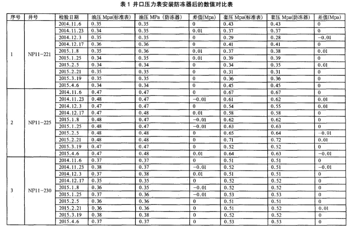 3.2準確性實驗 新研制的壓力表防凍器裝置在冀東油田南堡作業區采油一區 進行了現場壓力準確性試驗,從2014.11.6日在3 口抽油井口分別安裝帶有防凍器的油壓表和套壓表開始進行實驗,2015.4.6日天氣轉 暖后拆卸,在長達5個月室外溫度在-251C到25 X:范圍內的實驗中沒 有凍壞一個壓力表,指針指示數據準確,轉動靈敏,同時在此期間每 月兩次跟標準壓力表進行對比校對數據,結果裝有防凍器的壓力表 同標準表顯示的數據誤差極小,可以忽略不計。(見表1)