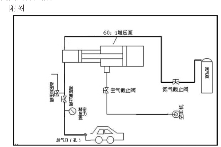 車用燃氣壓力表在線檢定裝置主要由以下設備組成:(見附圖)精 密壓力表、氮氣瓶、增壓泵、空壓機、各控制閥門、高壓氣體專用接口等。 基本原理或者說操作過程如下:利用空壓機輸出帶有一定壓力的空氣 到增壓機,使增壓機工作把從氮氣瓶輸出到增壓機的氮氣加壓到0 40MPa的高壓(空壓機產生的較高壓力的空氣只是驅動增壓泵工作,不 會滲透到氮氣壓力管道中),高壓氮氣通過車用燃氣裝置的加氣口(孔孔〕 到達車用燃氣裝置壓力管道和各控制調節閥門,這樣高壓氮氣就能同 時傳遞到精密壓力表和車用燃氣壓力表,通過精密壓力表和車用燃氣 壓力表的示值對照就能檢定車用燃氣壓力表是否滿足規程要求,從而 判定其是否合格。