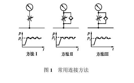 壓力表用以測量流體傳動管道中某工作點的壓 力,使用時為防止壓力表受沖擊損壞,一般不將其直接 接入管道,常用的有以下3種連接方法(見圖1)。對 靜壓力來講,3種接法的測量結(jié)果相同;但當管道中的 壓力有脈動或沖擊時,3種連接方法對測量結(jié)果產(chǎn)生 不同的影響。