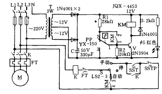 2.元件選用本電路適用 電機(jī)功率不大于10kW,接觸器額 定電流不大于20A的場(chǎng)合。當(dāng) 電機(jī)功率為10?30kW、接觸器額 定電流不大于60A時(shí),KM應(yīng)改 用JQX - 1型,其額定電壓27V。 該繼電器有兩對(duì)容量不同的常斷 觸點(diǎn),大容量觸點(diǎn)作KM的3 -4, 小容量觸點(diǎn)作 KM 的 1 - 2。 變壓器T更換 為 5W、220V/ (2 x 27)V,其 他不變。V可 用 9013、 9014 或2N555要求 /3>80o