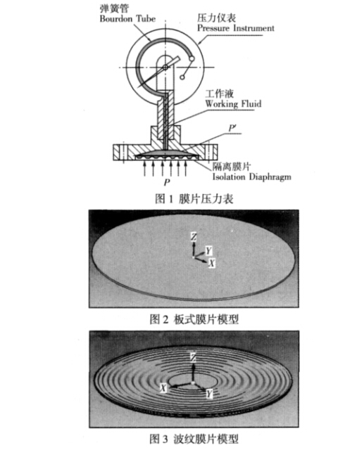 在石油化工、制堿、化纖、染化、制藥、食品等工業部門中常常 遇到強腐蝕、高溫、高黏度、易凝固、有固體浮游物的惡劣介質,此類 惡劣介質的壓力測量是不能直接用壓力儀表進行測量的。為使通用 型壓力表能適用于測量此類介質的壓力而同時又避免介質直接進 入壓力儀表,防止沉淀物積聚和腐蝕儀表,就必須采用由膜片隔離 器與通用型壓力儀表組成一個系統的膜片壓力儀表,如圖1所示。 介質壓力P作用于膜片上,膜片把壓力傳遞給工作液既而實現壓 力表顯示壓力。但目前的膜片壓力表在測量惡劣介質時常出現如 下問題:(1)系統啟動時流體脈動引起壓力表波動很大,甚至使壓力表損壞(如正常工作表壓在0.4MPa,但1.6MPa的壓力表也常損 壞)。⑵膜片由于介質脈動作用產生疲勞,加之腐蝕作用,膜片很快 失去彈性,甚至破損失效。通過三維CAD和FEMAP有限元技術對 膜片受壓進行分析,為研宄膜片提供一種方法;同時也提出了一種 延長膜片壽命的阻尼式引壓方式,經現場使用證明了可靠性。