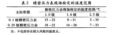根據表1數據,按照測試不確定度比不小于4:1的 要求,精密壓力表開展艦船壓力表現場檢定的溫度范 圍見表2。