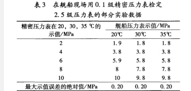 選兩組量程范圍為0 ~0. 6 MPa, 0-10 MPa, 0 ~ 60 MPa,準確度等級分別為1. 0級、1. 6級、2. 5級共 18塊艦船壓力表,一組在碼頭庫房,一組在艦船艙室 (在0級和1級海況下),在環境溫度為5,10, 30, 35t;四個溫度點,分別以準確度等級為0.1級、0.25 級的精密壓力表和0. 05級的數字壓力計為主標準器進 行現場檢定,并按本文3.1,3.2的合格判據進行判 定,現場檢定結果和實驗室檢定結果一致。其中,量 程范圍同為0 ~ 10 MPa的0. 1級精密壓力表和2. 5級 艦船壓力表,在艦船現場和實驗室檢定(20 T列)的部分數據見表3。
