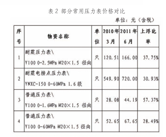 2011年整改后的普通壓力表Y100 0-1.6MPa將材質、 配件進行提升,簽約價44.19元/只,檢測費為35元/只。 最少使用壽命為一年,一個壓力檢測點一年需要1只壓力表, 使用費用為44.19元;壓力表檢測周期為6個月,技術監測 部門一年需檢測2次,檢測費用為70元;儀表工需要安裝 2次。從供應總成本看,一個壓力檢測點綜合費用為114.19 元,而技術監測部門僅檢測2次,儀表工安裝2次。