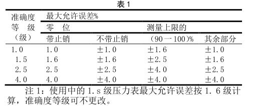 注2:壓力表最大允許誤差應按其量程百分比計算。 帶有止銷的壓力表,在通大氣的條件下,指針應緊靠沒 有止銷的彈簧管式壓力表,在通大氣的條件下,指針應位于 零位標志內,零位標志寬度應不超過表1規定的最大允許誤 差絕對值的2倍。