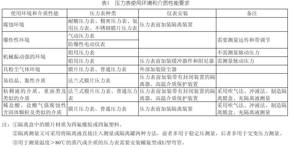 根據壓力表使用環境和被測介質的不同,如環境溫度、腐蝕情況、振動、介質易燃易爆等,選擇不 同類型的壓力表,詳見表1。