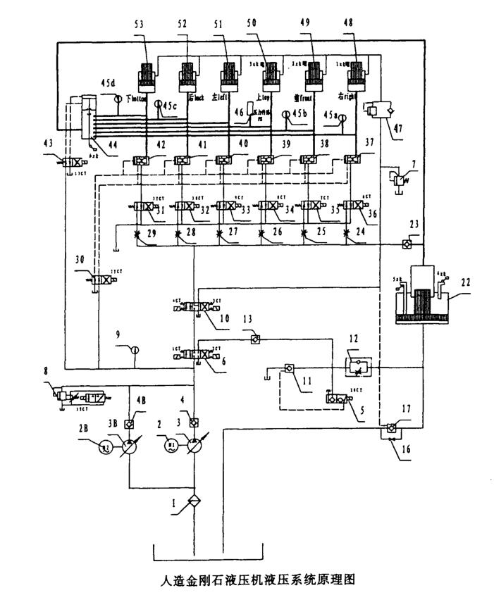 以桂林冶金機械總廠生產的CS — VI型六 面頂人造金剛石液壓機為例,如圖為其液壓系統 原理圖。與舊的液壓系統相比,新的液壓系統有 如下變化:(1)以016通徑的電液換向閥6、10 取代原010通徑的電磁閥,以滿足系統大流量 的需要;2)以不開泵的無動力卸壓(液控單向閥 11及電磁球閥5)取代開泵的有動力卸壓;3) 防止上缸活塞因自重落下,在回程油路上設置平 衡閥47;(4)為減小回程壓力,在回程油路上設 置二級溢流閥7。無論新舊液壓系統,系統壓力 表及超高壓壓力表仍設置在原位置,對不同階段 的壓力仍起顯示作用。